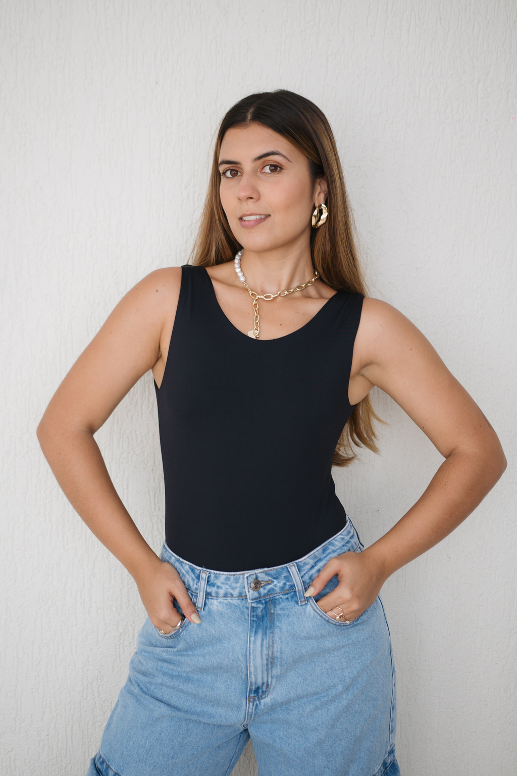 Body/maiô sem mangas com alças largas e decote nas costas. Possui shape justo e é confeccionada em tecido duplo de poliamida com elastando, trazendo conforto e toque macio ao corpo.