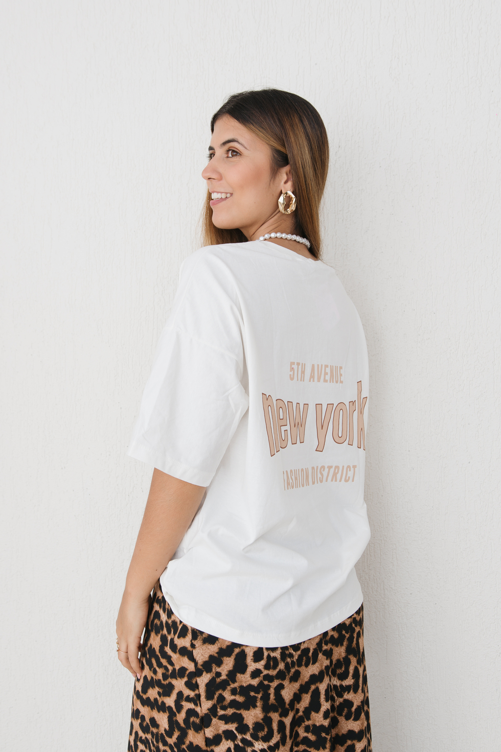 T-shirt em modelagem over com estampa na parte frontal e posterior. As t-shirts na modelagem over estão no auge do guarda-roupa de todas as fashionistas contemporâneas e deixa qualquer look mais interessante.
