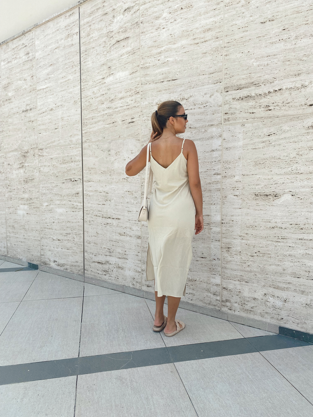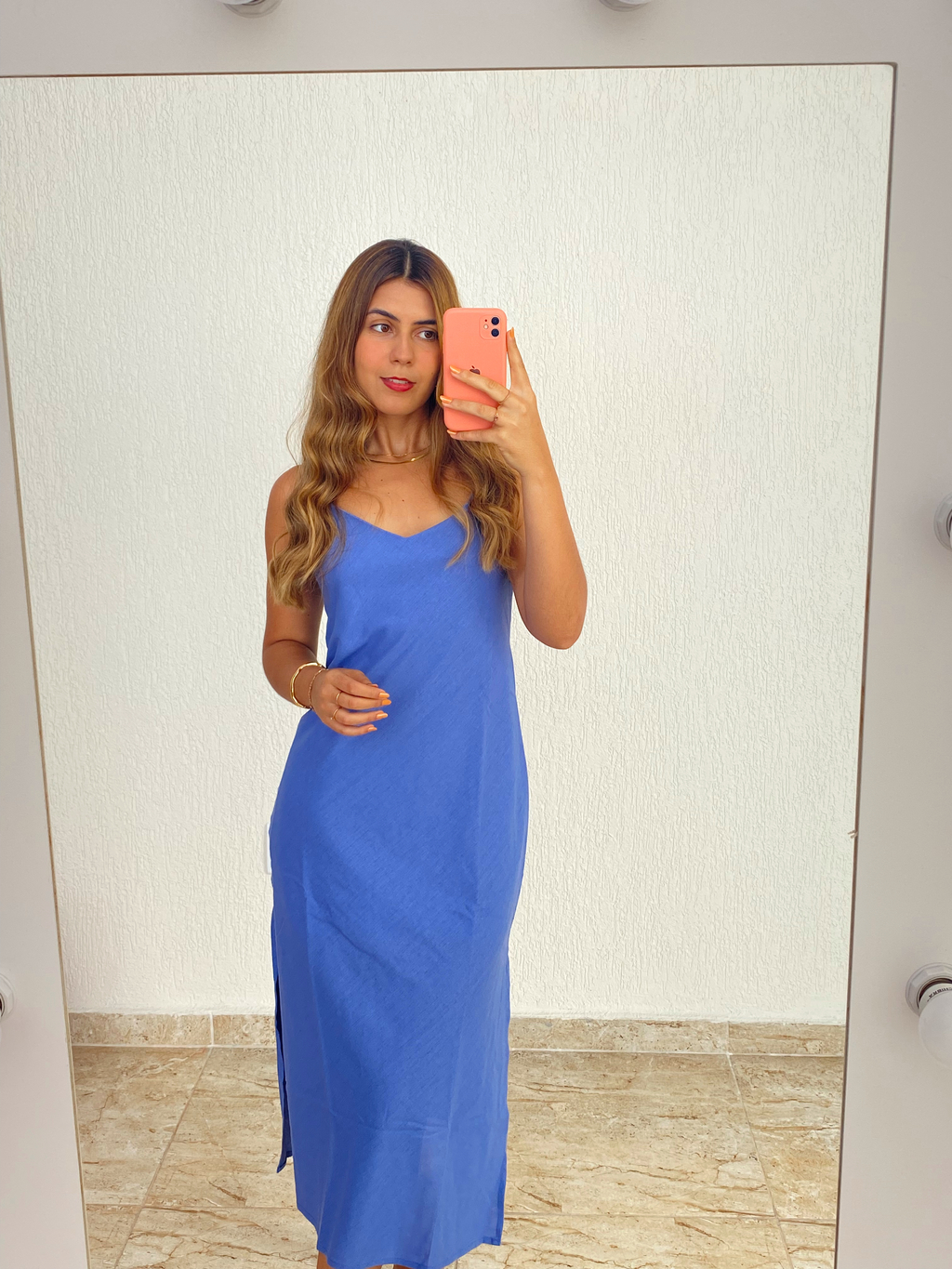Vestido midi confeccionado em linho, com fendas laterais e alças reguláveis. É um modelo elegante que possui tecido de origem natural o que o torna muito agradável ao toque.